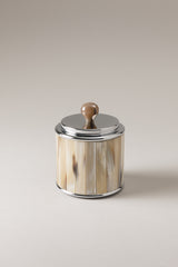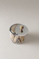 Complemento immancabile all'interno di un set di accessori, il barattolo porta cotone diventa protagonista della stanza da bagno grazie al rivestimento sfaccettato in corno di Zebù. I particolari metallici ed il pomolo che riprende le sfumature vintage del corno ne sono il perfetto completamento.