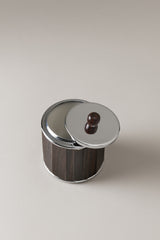 Complemento immancabile all'interno di un set di accessori, il barattolo porta cotone diventa protagonista della stanza da bagno grazie al rivestimento sfaccettato in legno. I particolari metallici ed il pomolo che riprende l'austerità del pregiato materiale ne sono il perfetto completamento.