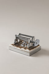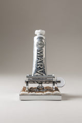 Un meccanismo tanto elegante da riuscire difficilmente ad immaginarne una collocazione nella stanza da bagno. Il misterioso oggetto in ottone cromato che poggia su di una rustica base in palco di cervo nasconde sotto un'enigmatica estetica la sorprendente natura della sua utilità; la rotazione dello spremi tubetto permette di beneficiare completamente della quantità di dentifricio senza sprecare prodotto.
