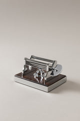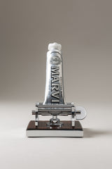Un meccanismo tanto elegante da riuscire difficilmente ad immaginarne una collocazione nella stanza da bagno. Il misterioso oggetto in ottone cromato che poggia su di una ricercata base in legno nasconde sotto un'enigmatica estetica la sorprendente natura della sua utilità; la rotazione dello spremi tubetto permette di beneficiare completamente della quantità di dentifricio senza sprecare prodotto.