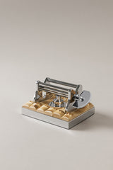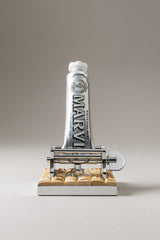 Un meccanismo tanto elegante da riuscire difficilmente ad immaginarne una collocazione nella stanza da bagno. Il misterioso oggetto in ottone cromato che poggia su di un'esotica base in radice di bambù nasconde sotto un'enigmatica estetica la sorprendente natura della sua utilità; la rotazione dello spremi tubetto permette di beneficiare completamente della quantità di dentifricio senza sprecare prodotto.
