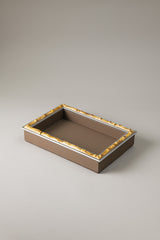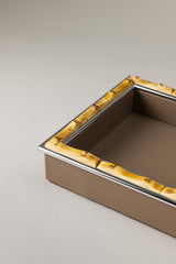 Approdo perfetto per tutto quanto non possiede una collocazione esclusiva ma è così indispensabile da dover essere sempre a portata di mano; il vassoio vuotatasche rivestito in vitello nautico è delineato da una cornice cromata all'interno della quale le placchette in radice di bambù, lavorate artigianalmente una ad una, compongono un unico e possibile mosaico.