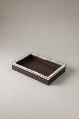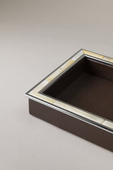 Approdo perfetto per tutto quanto non possiede una collocazione esclusiva ma è così indispensabile da dover essere sempre a portata di mano; il vassoio vuotatasche rivestito in vitello nautico è delineato da una cornice cromata all'interno della quale le placchette in corno di zebù, lavorate artigianalmente una ad una, compongono un unico e possibile mosaico.