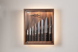 Come un sipario che si apre sul più gustoso dei palcoscenici, il pannello da coltelli è pensato per chi vive la cucina come la più suprema delle arti. Realizzato in noce canaletto con le descrizioni di ognuno dei nove utensili impresse nel legno, permette di esporli con un sistema di calamite nascoste esteticamente funzionale. E’ possibile personalizzare l’illuminazione del pannello a partire da una soluzione wall wash, da atmosfera, diffusa su parete, oppure una luce interna che illumina completamente il set. Entrambe le accensioni sono regolabili da due diversi interruttori. La coltelliera è chiusa da un’anta a battente di vetro, in modo che il set rimanga visibile ma al contempo protetto. Il set è composto da: spelucchino curvo, coltello da verdure, coltello dentato per pomodori, coltello per affettare i salumi, coltello trinciante, coltello da pane, coltello da chef’s e coltello per arrosti. Tutte le lame sono forgiate in acciaio inossidabile lucidate a specchio con impugnature in POM.