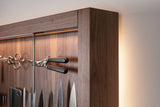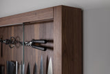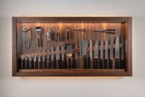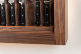 Come un sipario che si apre sul più gustoso dei palcoscenici, il pannello da coltelli è pensato per chi vive la cucina come la più suprema delle arti. Realizzato in noce canaletto con le descrizioni di ognuno dei ventisette utensili impresse nel legno, permette di esporli con un sistema di calamite nascoste esteticamente funzionale. E’ possibile personalizzare l’illuminazione del pannello a partire da una soluzione wall wash, da atmosfera, diffusa su parete, oppure una luce interna che illumina completamente il set. Entrambe le accensioni sono regolabili da due diversi interruttori. La coltelliera è chiusa da due ante a scorrimento di vetro, in modo che il set rimanga visibile ma al contempo protetto. Il set è composto da: uno spelucchino curvo, uno spelucchino dritto, un coltello per i salumi, un coltello per filettare, tre colteli cuoco, un coltello per disossare, una spatola, un forchettone, uno spacca ossa, un acciaiolo, due coltelli per l’arrosto, un coltello per il pane, una coltello per il prosciutto, un cavatappi, forbici da cucina, coltello formaggio grana, un coltello apriostriche, un guanto apriostriche, uno schiaccianoci, un trinciapolli, un tagliatartufi, un pelapatate, un levacapsule ed un coltello pomodoro.. Tutte le lame sono forgiate in acciaio inossidabile lucidate a specchio con impugnature POM.