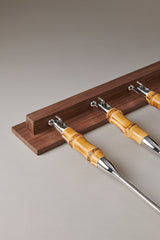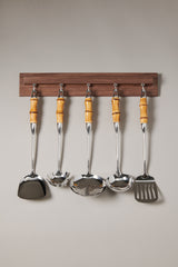 Le calde impugnature in radice di bambù, accostate alla lucentezza dell'acciaio inossidabile, li rende accessori dalla valenza estetica talmente forte da volerne riconsiderare la posizione all'interno della cucina. L'azione del 'servire' assume connotati completamente nuovi ed invita ad esibire i suoi strumenti. Azione possibile nonchè di sicuro effetto grazie al supporto realizzato in noce canaletto e disegnato per ospitare: una posata per spaghetti, un cucchiaione da servizio, una spatola, un mestolo ed una schiumaiola.