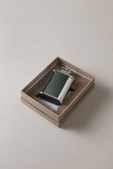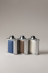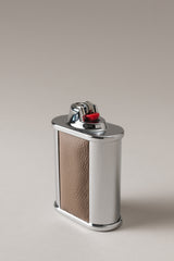 Il porta accendino da tavolo è destinato ad ospitarne un modello Bic basic, che inserito all'interno delle pareti metalliche in ottone cromato impreziosite da inserti in pelle nautica, trattata per resistere ad umidità e salsedine, ne amplifica i contorni rendendoli inaspettatamente preziosi. A dimostrazione di come 'l'abito' possa davvero contribuire talvolta a fare il 'monaco'. (ACCENDINO BIC NON INCLUSO).