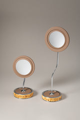 L'estetica richiede controllo e cura estrema dei dettagli, azioni delle quali lo specchio diviene simbolo, riflettendone importanza e qualità. Lo specchio ingrandente (x3) è interamente rivestito in vitello nautico e può essere ruotato sul piano sia verticale che orizzontale grazie al meccanismo integrato. La base è caratterizzata dalla decorazione con piccoli listelli in radice di bambù, che lo rendono un complemento dalla natura eccentrica e tenace.