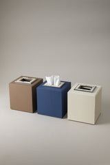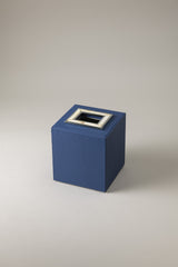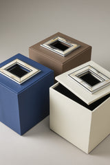 Oggetti di uso comune che grazie alla perfezione dei materiali naturali e la maestria del lavoro artigiano divengono esempi di ricercato design. La scatola in legno rivestita in vitello nautico rivela al suo interno la misura perfetta per ospitare un porta fazzoletti a cubo. La cornice in metallo ne decora la fessura con la sorprendente raffinatezza del corno di zebù, varcando il confine che separa il 'consueto' dallo 'straordinario'.