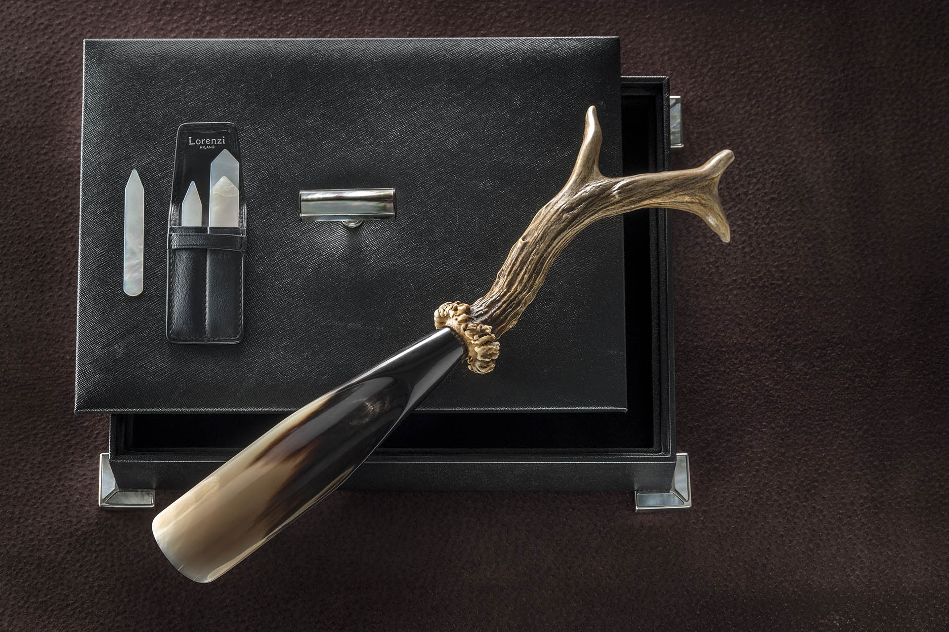 I valet geometrici si vestono di mogano e madreperla, di cervo e bambù. Ci sono spazzole di ogni fatta e impiego, suit cover e grembiuli per la pulizia delle calzature in morbida pelle d’agnello. Alla cura delle scarpe sono dedicati i necessaire anche in formato da viaggio, i calzanti in corno levigati con perizia e le custodie in shearling. Materie naturali che si sposano con quelle tessili più preziose, le lane pettinate, il cachemire, il lino e la seta. Tutto ha un apposito kit di mantenimento. Un luogo di valore per cose di valore.