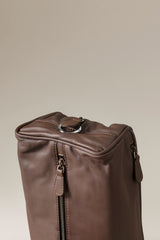 Scrigno di personali tesori, il necessaire da viaggio cela gli strumenti indispensabili dei più piccoli rituali quotidiani. In nappa di agnello, puro piacere per il tatto, è suddiviso in un morbido scomparto centrale, due laterali ed uno sottostante, quasi segreto, mentre l'interno è foderato in tessuto lavabile, per far sì che i segni del suo utilizzo siano tali soltanto nei ricordi.