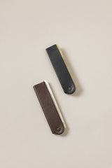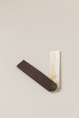 La soffice levigatezza del pellame si intona alla rigida eleganza del corno; materiali agli antipodi ma perfettamente in accordo nel pettine pieghevole e tascabile realizzato in corno, materiale privilegiato per la sua natura antistatica, ed inserito all'interno di una custodia in nappa di agnello.