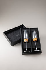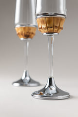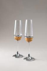 Una raffinata confezione in pelle, unicamente sagomata, ospita una coppia di calici flute da champagne realizzati incastonando con artigiana maestria una composizione di placchette in radice di bambù nell'ottone cromato che ne riveste anche le basi. Quando il momento lo richiede, ogni cosa trova il suo innesto perfetto.
