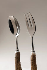 Una cultura che non accetta compromessi; la tavola è un campo di gioco con dettami e regole ben precise. La mise en place riveste un ruolo decisivo che non transige su varietà e metodologie dei suoi principali strumenti: le posate. La coppia composta da cucchiaio e forchetta in acciaio inossidabile svetta su un'impugnatura in palco di cervo che ne avvolge le aderenze alla perfezione.