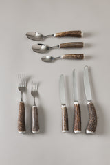 Una cultura che non accetta compromessi; la tavola è un campo di gioco con dettami e regole ben precise. La mise en place riveste un ruolo decisivo che non transige su varietà e metodologie dei suoi principali strumenti: le posate. Il set composto da forchetta, coltello, coltello da bistecca e cucchiaio da tavola, forchetta, coltello e cucchiaio da dessert e cucchiaino da caffè in acciaio inossidabile svetta su un'impugnatura in palco di cervo che ne avvolge le aderenze alla perfezione. Disponibili componenti sciolti.
