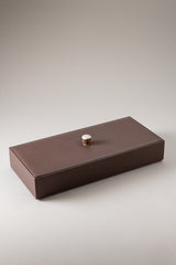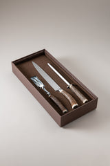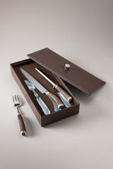 La cucina va rispettata ed assecondata con sapienza in tutte le sue modalità di espressione: il set per arrosti contiene forchettone, coltello e acciaiolo dalle impugnature in palco di cervo. Il vassoio in legno, rivestito in pelle e Alcantara, è rimovibile e la scatola può diventare un ricercato porta oggetti.