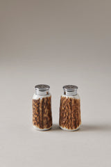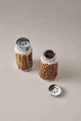 L'anima interna della coppia di spargi sale e spargi pepe è realizzata in vetro ed inserita all'interno del rivestimento in palco di cervo, che ne diventa così nuova naturale custodia.