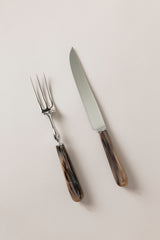 Una cultura che non accetta compromessi; la tavola è un campo di gioco con dettami e regole ben precise. La mise en place riveste un ruolo decisivo che non transige su varietà e metodologie dei suoi principali strumenti: le posate. La coppia trinciante composta da coltello e forchettone da arrosto in acciaio inossidabile svetta su un'impugnatura in corno di Zebù che ne avvolge le aderenze alla perfezione.