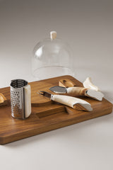 Quando esperienza ed artigianalità, seppur diverse, si incontrano: il set da parmigiano è composto da una campana in vetro soffiato, grattugia, coltello e forchetta da parmigiano adagiati su di un vassoio in legno Iroko rifinito con olio di lino. Tutte le impugnature sono realizzate adattando la natura della zanna di facocero allo strumento da impreziosire, così da valorizzare magistralmente il momento ed il gusto dedicati ad un prodotto simbolo dell'eccellenza gastronomica italiana nel mondo. In particolare, l'impugnatura della grattugia è agevolmente divisibile dallo strumento per facilitarne pulizia e lavaggio.