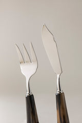 Fine ed elegante, la coppia di posate da pesce composta da forchetta e coltello in acciaio inossidabile risplende della lucida impugnatura in corno di Zebù, valorizzata da un processo di lavorazione artigianale che rivela le sorprendenti e sempre uniche sfumature del materiale.
