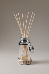 Un elemento tanto soft e discreto quanto piacevole; il profumo scrive con scie delicate il carattere di una casa. Il diffusore per ambiente in vetro soffiato è rivestito con listelli in rustico palco di cervo, lavorato in placche uniche per coronarne alla perfezione la circonferenza. Il tappo cromato consente di conservare il prodotto in attesa del successivo profumato rilascio.