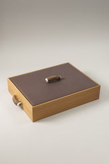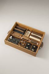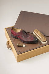 La manutenzione di un oggetto prezioso è un lusso quasi quanto l'oggetto stesso. In particolar modo se si tratta di calzature, la meticolosità da riservare al loro trattamento prevede una combinazione particolare di strumenti e fasi. Il vassoio per la pulizia delle scarpe costruito in legno di Iroko lucidato con cera d'api, contiene due spazzole grandi a setola media, due con setola morbida (Sciuscià), due di misura piccola ed una per gli scamosciati, tutte in pregiato legno di Ovangkol. Oltre ad una serie di creme il set comprende tre spandi lucido, un calzante di corno ed un panno da Sciuscià. Il coperchio è foderato in pelle di cinghiale e il suo retro diventa un piano d'appoggio perfetto durante la pulizia. Le maniglie sono realizzate in palco di cervo, dai rilievi naturali e rustici.