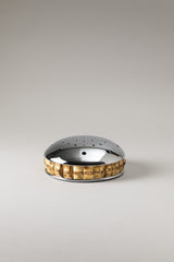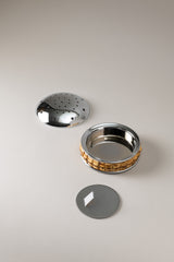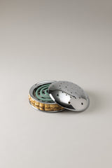 Un contenitore in ottone cromato rivestito da placchette in radice di bambù diventa elegante 'ambasciatore' di un oggetto tanto esteticamente trascurato quanto concretamente insostituibile; il porta zampirone acquista ruolo e posto d'onore grazie al supporto interno che sostiene la spirale d'incenso ed il coperchio forato che ne consente la diffusione, mantenendola segretamente custodita.