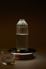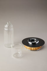 The bamboo root is an elastic material, yet sensitive to temperature and humidity changes. Being a natural substance, it might fade in color and lose its original shine over time, especially as regards those objects which often come in contact with water. Heat sources (radiators, flames, halogen lamps, etc.) might cause deformations or torsions. In case of dehydration we recommend a periodic application of a thin layer of ecological linseed oil or Vaseline, using a dry pad. The metal parts are not to be cleaned with abrasive substances but simply by using a buckskin cloth, or else in the case of persistent stains or smudges, with a cotton cloth dampened in denatured alcohol. Washing, when required, must be done by hand, with lukewarm water and mild detergents. Do not leave the material to soak and dry it thoroughly before storing it. Occasionally, tiny bubbles may appear in the glass. They are due to the artisanal blowing process of the material and are part of the uniqueness features of these products.