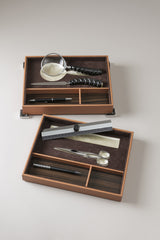 Il doppio vassoio da scrivania è realizzato intorno alle maestose suggestioni proprie dei paesaggi selvaggi, in pelle con fondo in Alcantara, inserti in ebano Makassar ed un set che include un righello in ottone