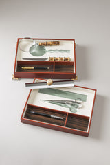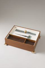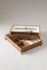 Il doppio vassoio da scrivania è realizzato intorno alle calde suggestioni proprie dei paesaggi esotici, in pelle con fondo in Alcantara, inserti in ebano Makassar ed un set che include un righello in ottone