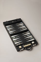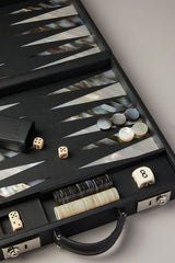 Tutto al suo interno è realizzato a mano con maestria artigiana utilizzando alcuni dei materiali più pregiati che la natura ci concede: gli accessori comprendono 2 tiradadi in pelle, 2 dadi tradizionali e 1 dado per il raddoppio, 15 pedine intagliate in madreperla australiana bianca assieme alle altre 15 in madreperla tahitiana grigia, i medesimi preziosi materiali utilizzati per scolpire gli inserti triangolari caratteristici della tavola di gioco. A partita conclusa, la valigia si chiude tramite una serratura con chiave, pronta a rilanciare i dadi di quella che sarà la prossima coinvolgente competizione.