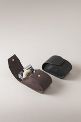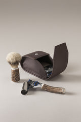 Un rito imprescindibile nella quotidianità di un uomo, la rasatura è un momento al quale è d'obbligo dedicare tempo e cura. Anche e specialmente fuori casa, laddove la situazione può imporlo maggiormente, l'astuccio in morbida nappa di agnello contiene un vero e proprio kit in grado di sopperire alla perfezione alla mancanza degli oggetti domestici; un piccolo Rasoio Gillette Fusion con protezione rimovibile, un pennello da barba con ciuffo in puro pelo di tasso argentato ed una tasca interna per contenere le lame di ricambio. Ogni accessorio è realizzato con impugnature coniche in palco di cervo, per un'esperienza a contatto con la natura del materiale.