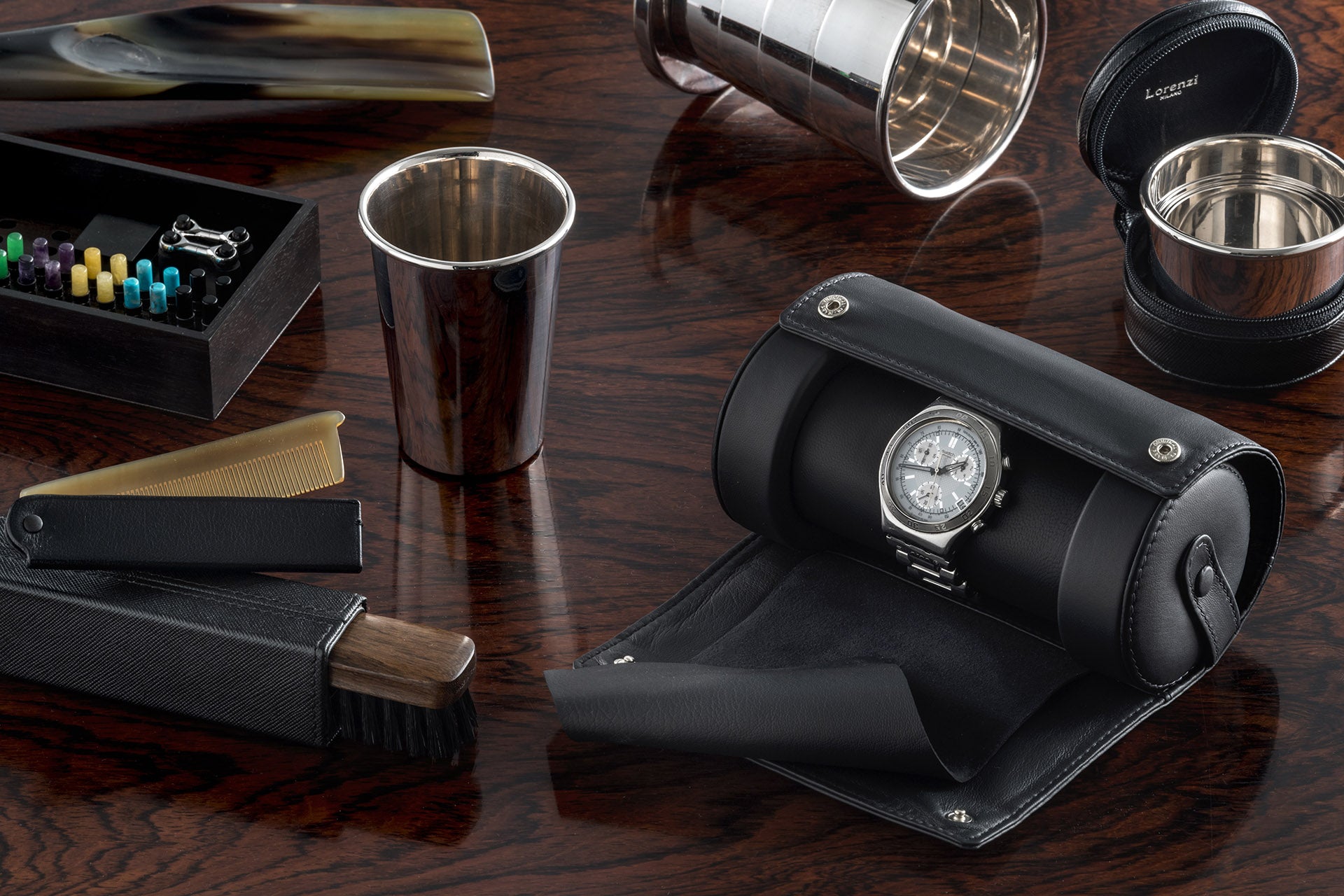 Zaini in lambskin o in coccodrillo, contenitori in pelle Saffiano e le custodie per orologi e gemelli. Finiture in bambù, zebù e cervo. Portafogli e portamonete in coccodrillo si accostano alla sofisticata levigatezza dello specchietto portatile in madreperla, tra gli accessori al femminile della collezione. Ogni cosa contiene e mantiene ordine ottimizzando lo spazio nel bagaglio, per recare con sé tutto ciò a cui non si riesce a rinunciare. La tradizione Lorenzi è piena di esempi virtuosi.