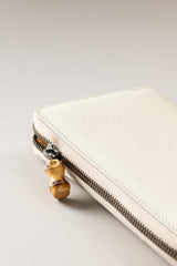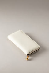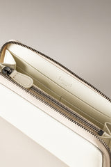Ideale per contenere in uno spazio ridotto tutto ciò che è necessario, il portafogli rigido in vitello nautico si schiude con la cerniera per rivelare un interno tono su tono e pratici scomparti dove riporre documenti, carte e monete. I tiretti della zip, in materiale naturale, rendono unico un accessorio che non può mancare tra gli ordinari tesori di una donna.