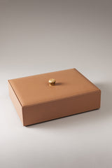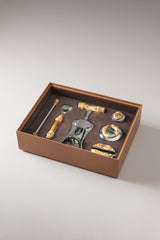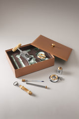 Un'elegante scatola in legno ricoperta in pelle di cinghiale è l'ideale vassoio di un set da vino raffinato ed essenziale, un gioiello destinato ad un pubblico di intenditori che include: cavatappi due leve cromato, tagliacapsule, termometro da vino in contenitore cromato, levacapsule, tappo e pinza per champagne.