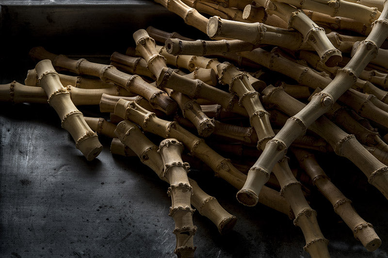 Being so solid, light and flexible at the same time, bamboo can be used in countless ways, for food, production, textile or decorative use. In Asia, where it grows abundantly, it can have different meanings: in China, its longevity is considered as a wish for a long life; in India it represents friendship and in Japan it is considered as a sacred barrier protecting shintoistic temples. We only manufacture the roots of the plant through a flame treatment: the flaming makes the outside of the material stronger and caramelizes and darkens the surface. No artificial varnish is used.