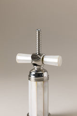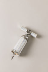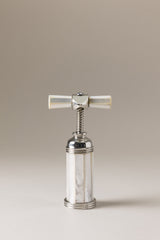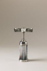 An object which enshrines its purpose between precious walls; the bell corkscrew has its body coated in small mother of pearl plaques, finished in an unrepeatable manner to cover sartorially its turned stainless steel spiral.