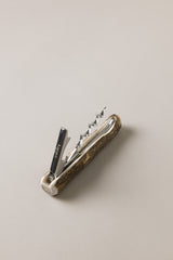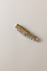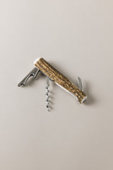 Il cavatappi con apribottiglie e lama a coltellino in acciaio inossidabile trova il suo spazio su misura all'interno del palco di cervo; una corazza estremamente duttile che viene fresata artigianalmente per diventarne l'alloggio perfetto. Uno strumento dall'allure professionale che, da solo, deve bastare al perfetto sommelier nella manifestazione più pratica della sua arte.