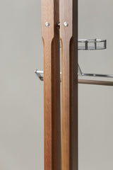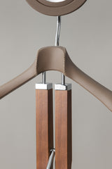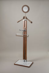 A discreet support for the daily rituals which ideally follow us from dawn to dusk, the valet stand is a cornerstone within the bathroom. Its humble and essential nature makes it adaptable to uses and locations. In its dressing room version, it wears an unusual charm and becomes a robe/dressing gown holder in solid Canaletto walnut wood, equipped with a metallic towel holder, a little tray for cosmetics and a mirror with magnifying glass (3x). The coat hanger and the mirror are covered in nautical calf leather and compose a perfect structure which lays on a rectangular base in white Carrara marble.