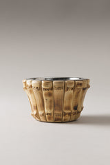 The bamboo root is an elastic material, yet sensitive to temperature and humidity changes. Being a natural substance, it might fade in color and lose its original shine over time, especially as regards those objects which often come in contact with water. Heat sources (radiators, flames, halogen lamps, etc.) might cause deformations or torsions. In case of dehydration we recommend a periodic application of a thin layer of ecological linseed oil or Vaseline, using a dry pad. The metal parts are not to be cleaned with abrasive substances but simply by using a buckskin cloth, or else in the case of persistent stains or smudges, with a cotton cloth dampened in denatured alcohol. Washing, when required, must be done by hand, with lukewarm water and mild detergents.