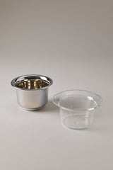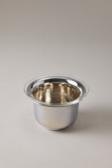 Symbol of an ancient rituality, of a precious gesture which requires a granting of time for oneself, without haste, without any loophole. The shaving bowl becomes the spokesman of a more traditional kind of shaving, container of its most essential products, to be 'whipped' and applied with a brush. In chromed brass, it contains a glass cup to better accommodates the rotating movement of the brush
