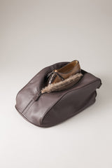 Like a second skin, the sheepskin nappa envelope, available in black or brown, becomes the ideal shell for the carrying of shoes. A shoe case with a masculine and rigorous line which fits by right into the perfect travel kit.