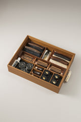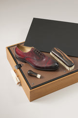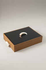 The maintenance of a precious object is as much of a luxury as the object itself. Particularly in the case of footwear, the meticulousness reserved to their treatment involves a particular combination of instruments and phases. The shoe-cleaning tray made of beeswax polished Iroko wood, contains two large medium-hardness brushes, two brushes with soft bristles (Sciuscià), two small-sized and one for suede, all in precious Makassar ebony wood wit unique natural veinings. In addition to a selection of creams the set includes three daubers, a shoehorn and a Sciuscià cloth. The lid is lined with Saffiano leather and its reverse becomes a perfect support surface during the cleaning. The handles are made of Warthog tusk, with primitive faceting.