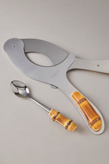 This set consists of a stainless steel urchin opener decorated with exotic bamboo plates and a spoon with a handle in the same material.