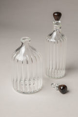 Le bottiglie in vetro rigato custodiscono questa dualità con una purezza quasi rituale, mentre il tappo in ebano Makassar, caldo e materico, introduce una naturalezza sobria e senza tempo.