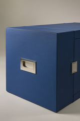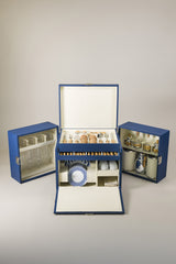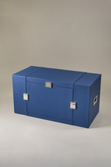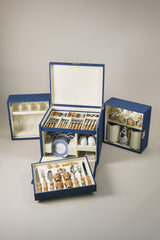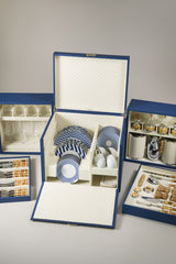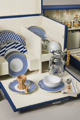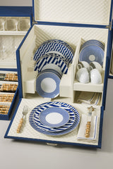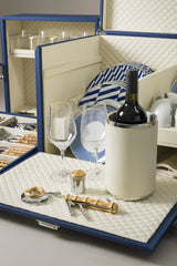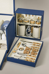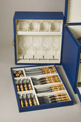 - a tray covered in nautical leather containing: four wicker woven egg holders, a bread knife, a set with a carving knife and fork, a cake shovel, a serving fork and spoon set, two chrome-plated sealing caps with bamboo inserts, a bamboo barman corkscrew, a champagne tong. Once closed, the set becomes transportable through the two flush embedded side handles in palladium-plated brass.