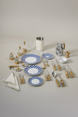 - a tray covered in nautical leather with a Makassar Ebony base containing: - a table set with four table and dessert forks, four table and dessert knives, four bamboo knife racks, four tea/coffee spoons, four oval-shaped egg teaspoons;