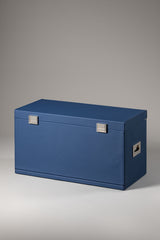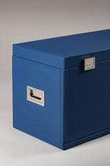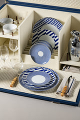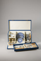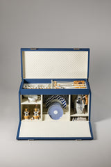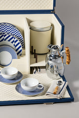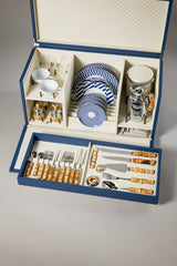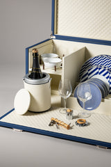 - a tray covered in nautical leather containing: a bread knife, a cake shovel, a serving fork and spoon set, one chrome-plated sealing cap with bamboo inserts, a bamboo barman corkscrew, a champagne tong. Once closed, the set becomes transportable through the two flush embedded side handles in palladium-plated brass.