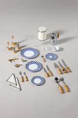 - a tray covered in nautical leather : - a table set with two table and dessert forks, two table and dessert knives, two bamboo knife racks, two tea/coffee spoons