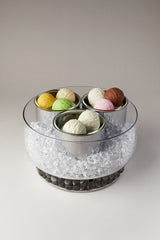 Our large glass bowl, set on an exquisite oryx base, is thoughtfully designed to hold ice, ensuring the ice cream remains fresh and perfectly chilled. Inside the main bowl, three elevated bowls in chromed brass each feature a removable glass insert, making them both dishwasher-safe and easy to clean.